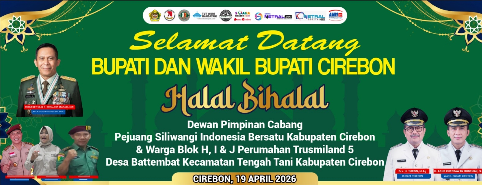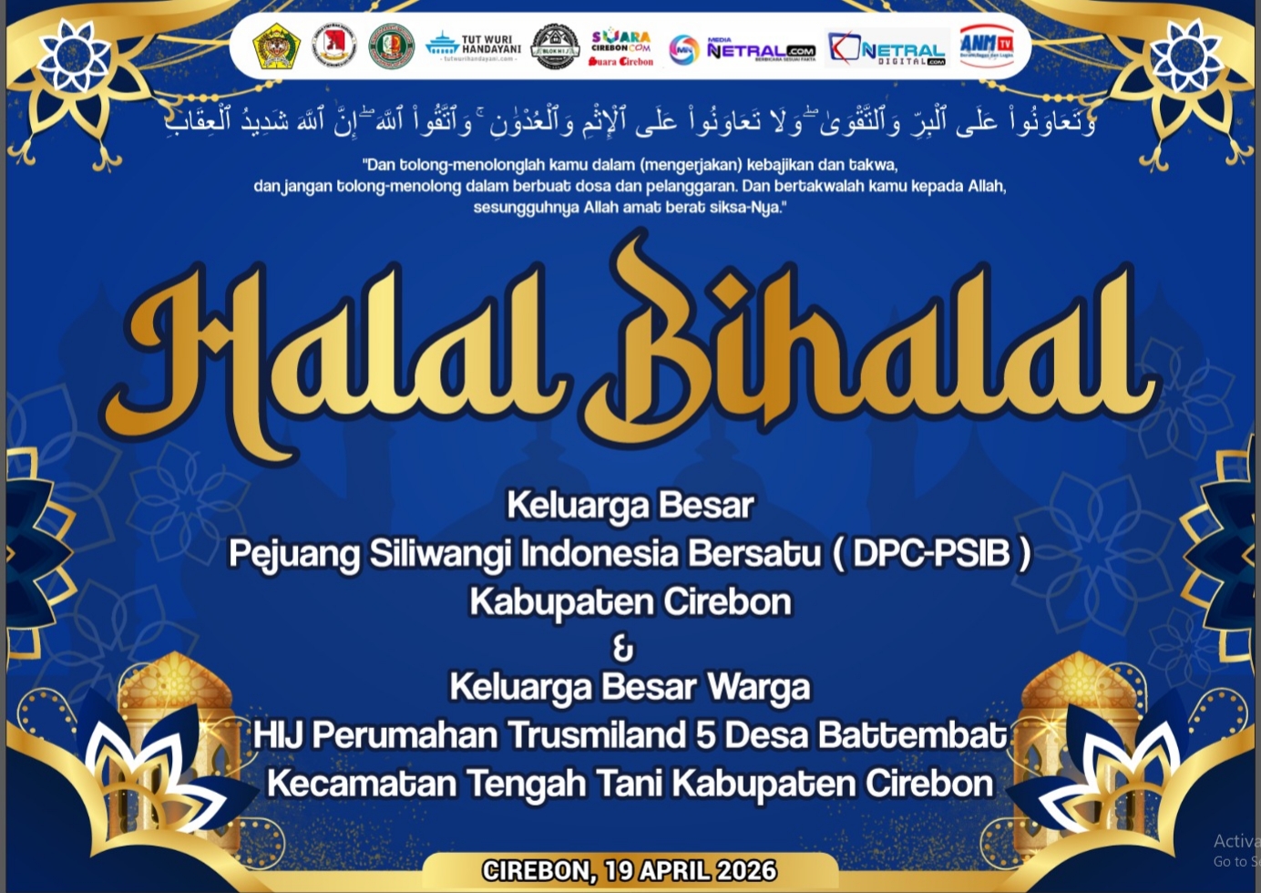 CIREBON, MEDIANETRAL.COM – Dewan Pimpinan Cabang Pejuang Siliwangi Indonesia Bersatu Kabupaten Cirebon, (DPC-PSIB) akan menggelar acara Halal Bihalal yang ke-7 pada Hari Minggu tanggal 19 April 2026 bertempat di Sekretariat DPC PSIB Kabupaten Cirebon Jl. Villa Intan I Perumahan Trusmiland Desa Battembat, Kecamatan Tengah Tani, Kabupaten Cirebon. (13/04/2026)