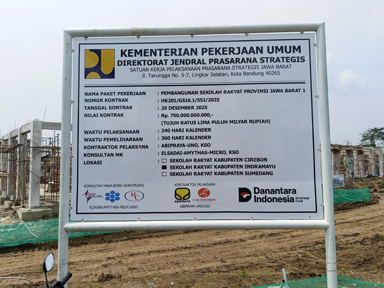 Berdasarkan data yang dihimpun GNPK-RI Jabar, proyek dengan nomor kontrak HK201/GS16.1/552/2025 tanggal 29 Desember 2025 ini dikerjakan oleh kontraktor pelaksana PT ABIPRAYA-UNO, KSO dengan konsultan manajemen konstruksi Elsadai-Emythas-Mikro, KSO. Waktu pelaksanaan proyek ditetapkan 240 hari kalender.