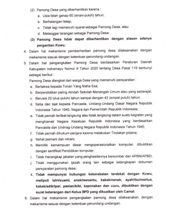 INDRAMAYU, MEDIANETRAL.COM – Aturan pengangkatan pamong desa kini tak lagi bisa dianggap sepele. Ketentuan dalam Pasal 2 Bab II tentang Pengangkatan Pamong Desa mempertegas bahwa rekrutmen harus berjalan ketat, transparan, dan bebas dari kepentingan pribadi.