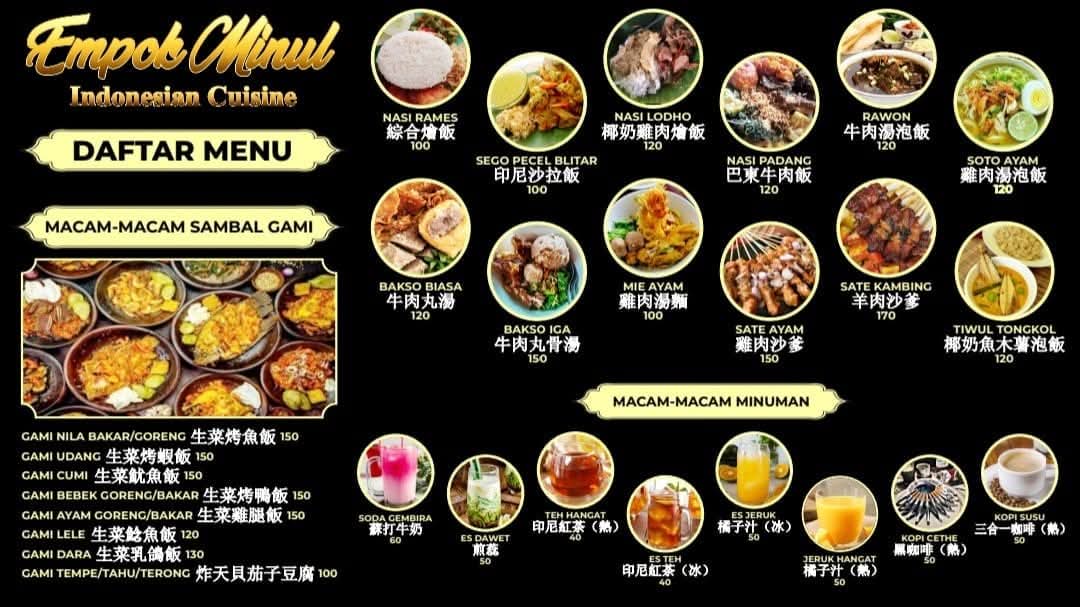 Warung Indo Mpok Minul fugang Taiwan menawarkan berbagai menu kuliner khas Nusantara, seperti nasi goreng, gado-gado, sate, dan masih banyak lagi khas menunya. Setiap hidangan disajikan dengan bumbu khas Indonesia yang membuatnya terasa otentik dan lezat, ada menu spesial dari warung Mpo Minul yaitu iga bakar & masakan seafood nya luar biasa menggugah selera